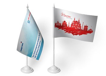 Для изготовления настольных флагов мы использует легкие ткани: атлас, шелк и габардин. Краска наноситься не поверх ткани, а на ее волокна, при помощи сублимационного метода, который позволяет добиться ярких насыщенных цветов, таким способом, что рисунок устойчив к температурному и световому воздействию, что продлевает срок службы настольных флажков. Если необходимо изготовить 2-х сторонние настольные флажки, то печать наноситься на 2 части флажка, которые затем соединяются методом спайки. Настольные флажки крепятся к специальной пластмассовой или металлической подставке, которая может быть для одного или нескольких флажков. Стандартный размеры настольных флажков – 12х18 см и 15х22 см.