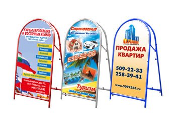 Рекламные штендеры или «раскладушки» идеальный вариант для компаний, находящихся вне зоны видимости пешеходов, именно пешеходов, а не автомобилистов, так как расположение штендеров для восприятия с проезжей части запрещено. Текстовую информацию на конструкции штендера желательно выдерживать минимальной, пример: название компании, основное направление деятельности или проводимая акция, схема расположения, телефон, сайт, часы работы и возможное дополнение к тексту яркая картинка.